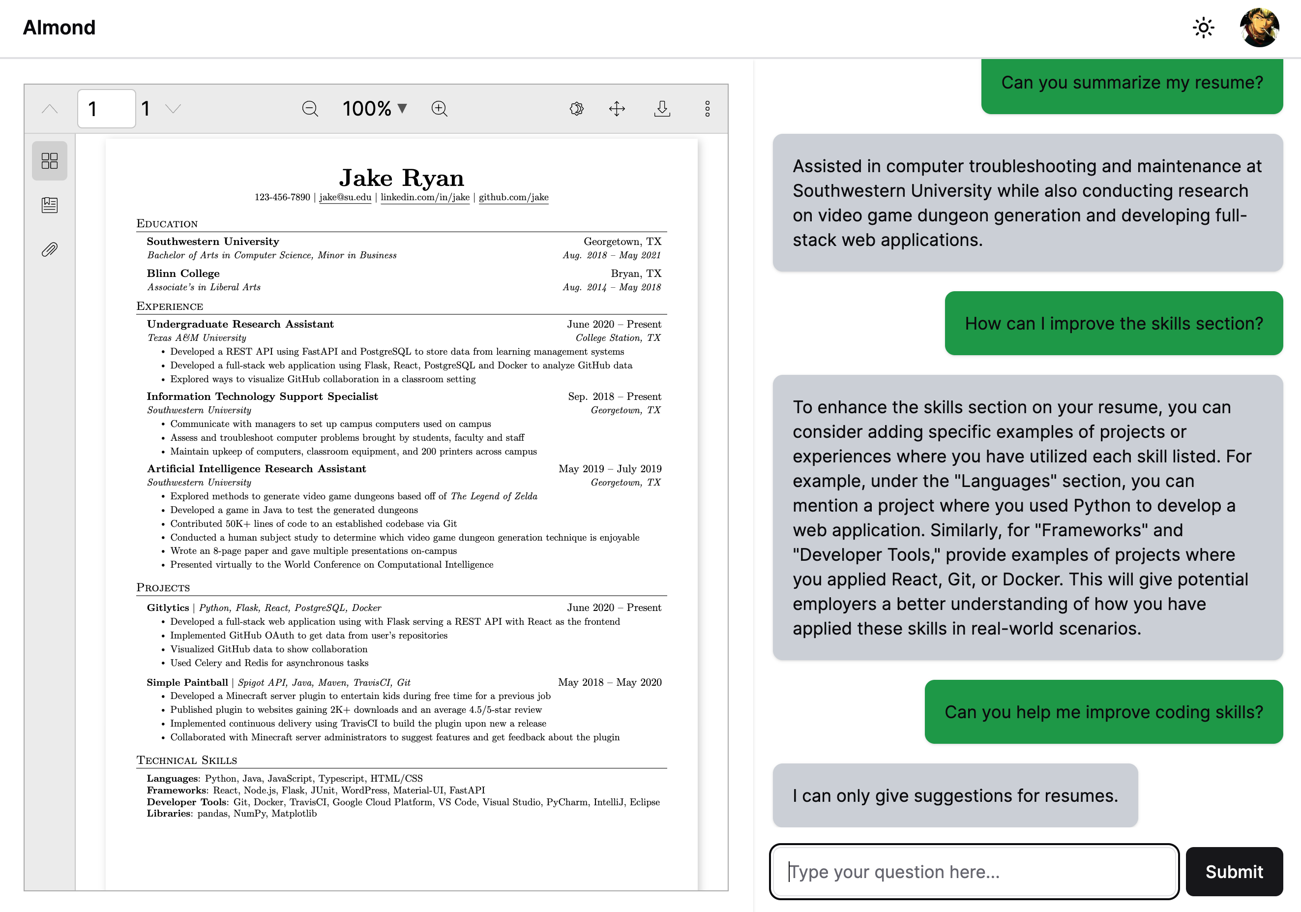Almond is a RAG application for providing contextual and useful suggestions to optimize your resume.